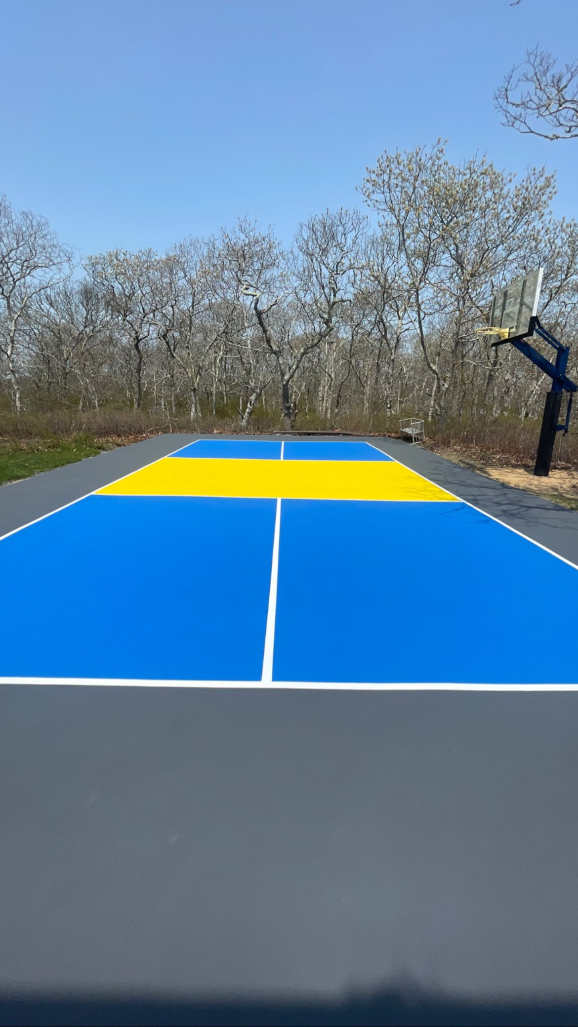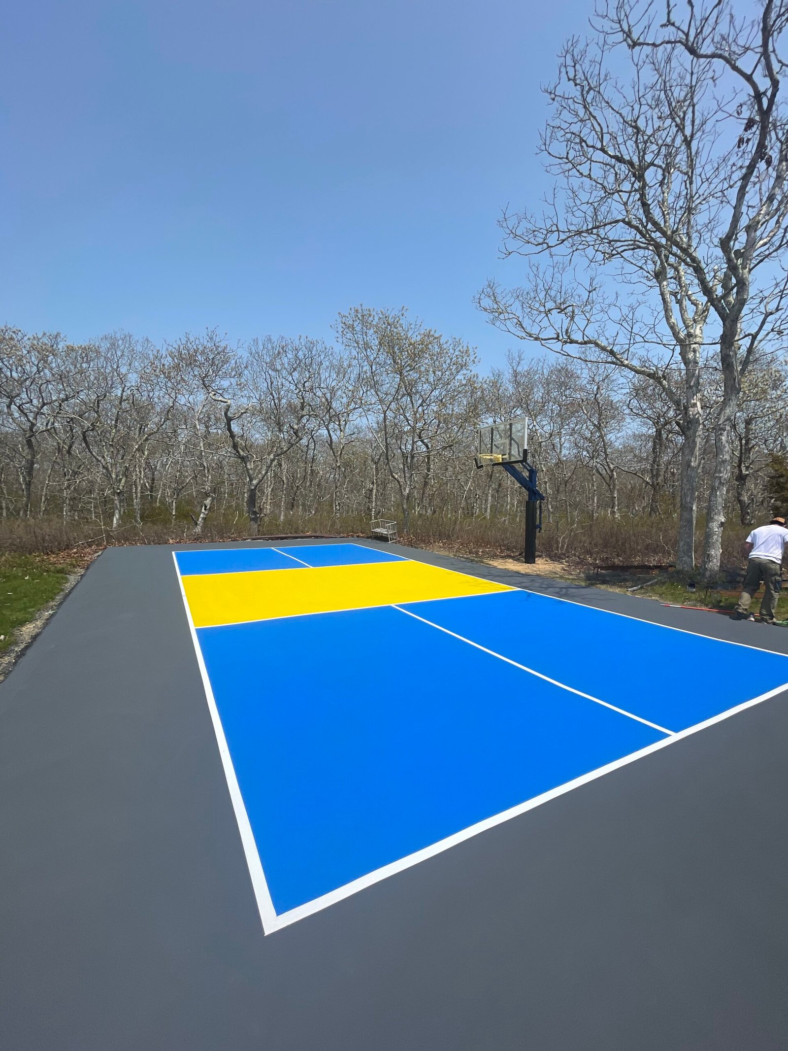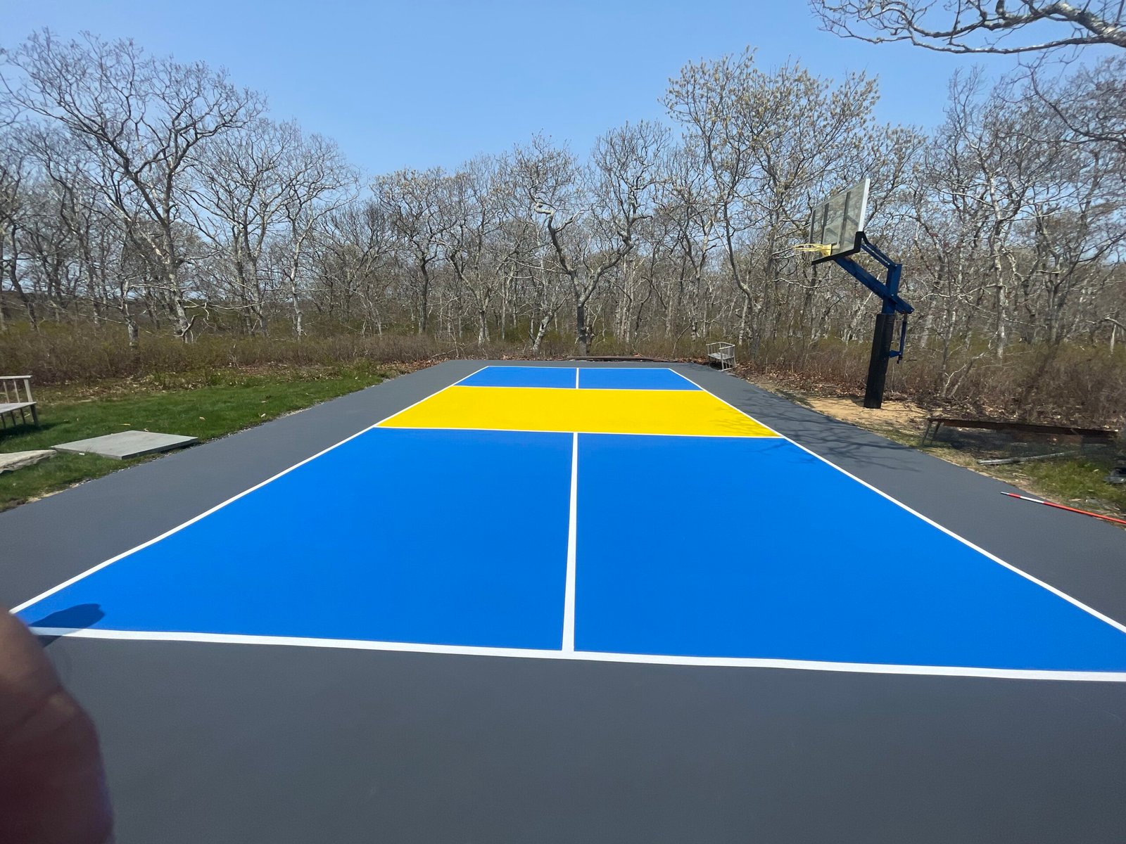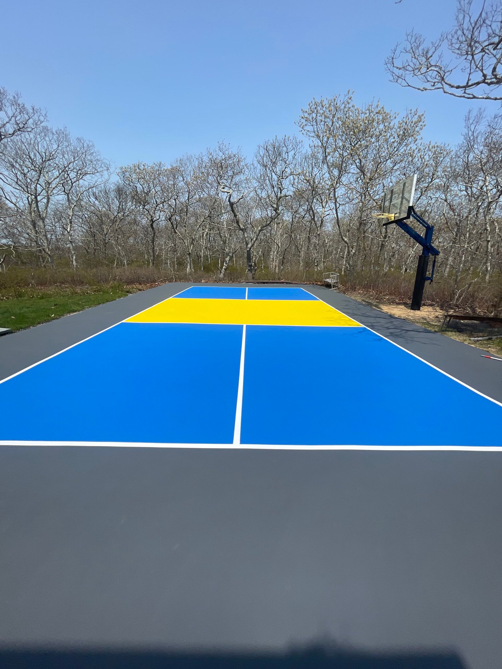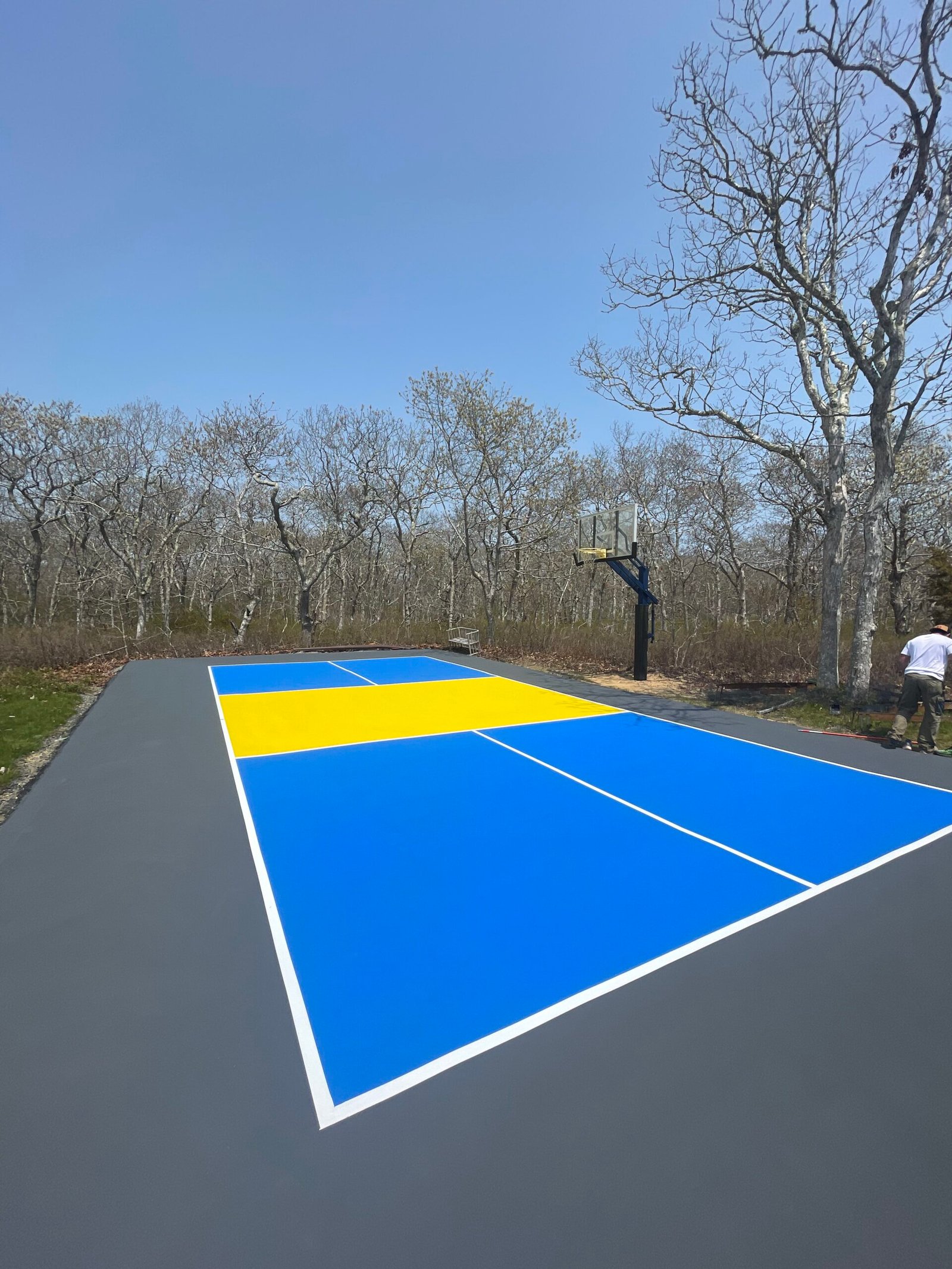 This custom residential project featured the design and installation of a private multi-sport court built for basketball and pickleball. The court was resurfaced and finished with a vibrant blue and yellow color scheme, creating a bold, modern look that stands out against the surrounding landscape.