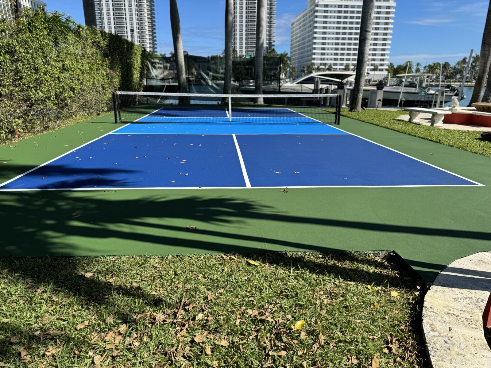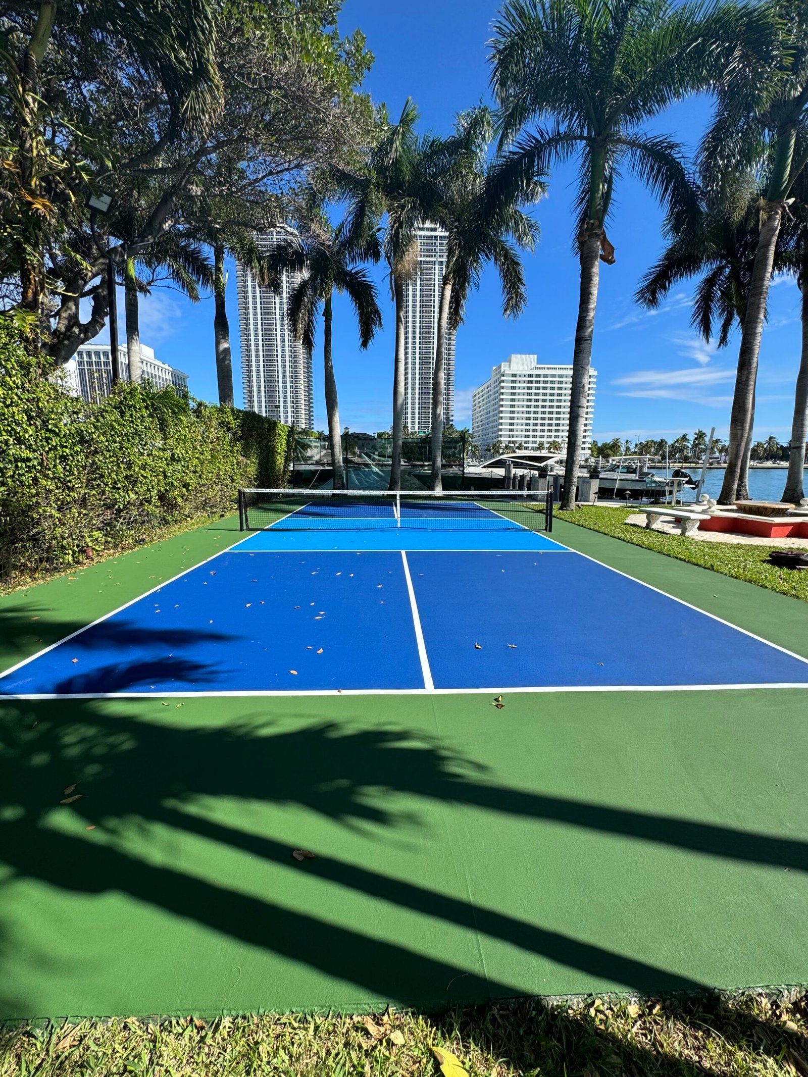 The project involved resurfacing and color design of a custom backyard pickleball court for a Miami residence.