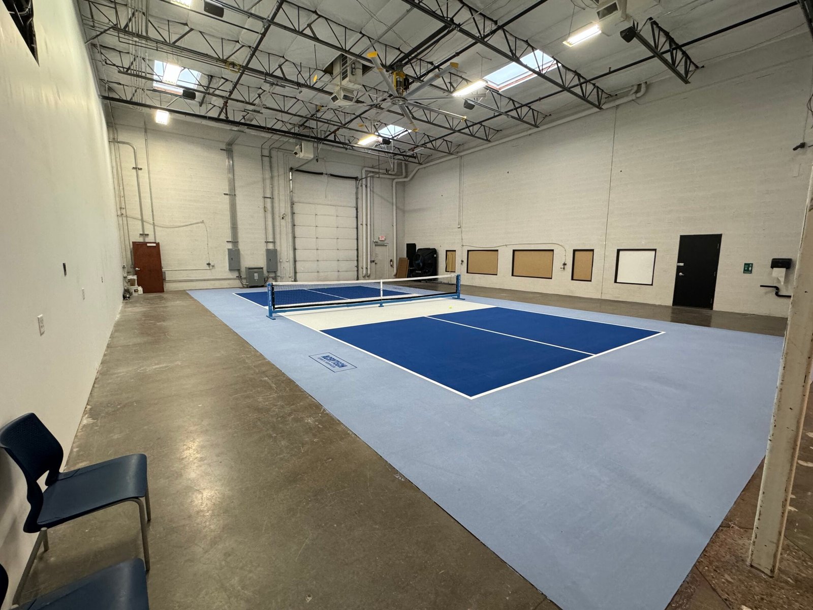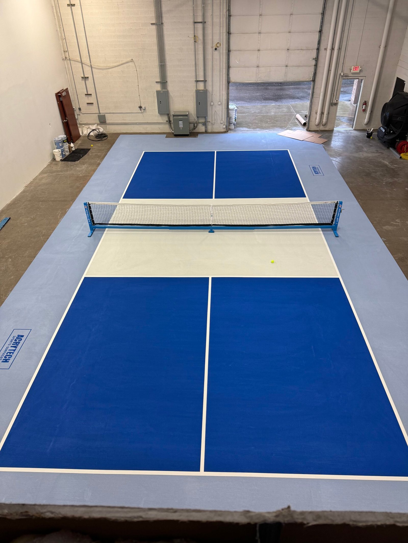 The project involved designing and installing an indoor pickleball court system in a converted warehouse. The team handled surface preparation, leveling, and application of acrylic coatings with custom color zones.